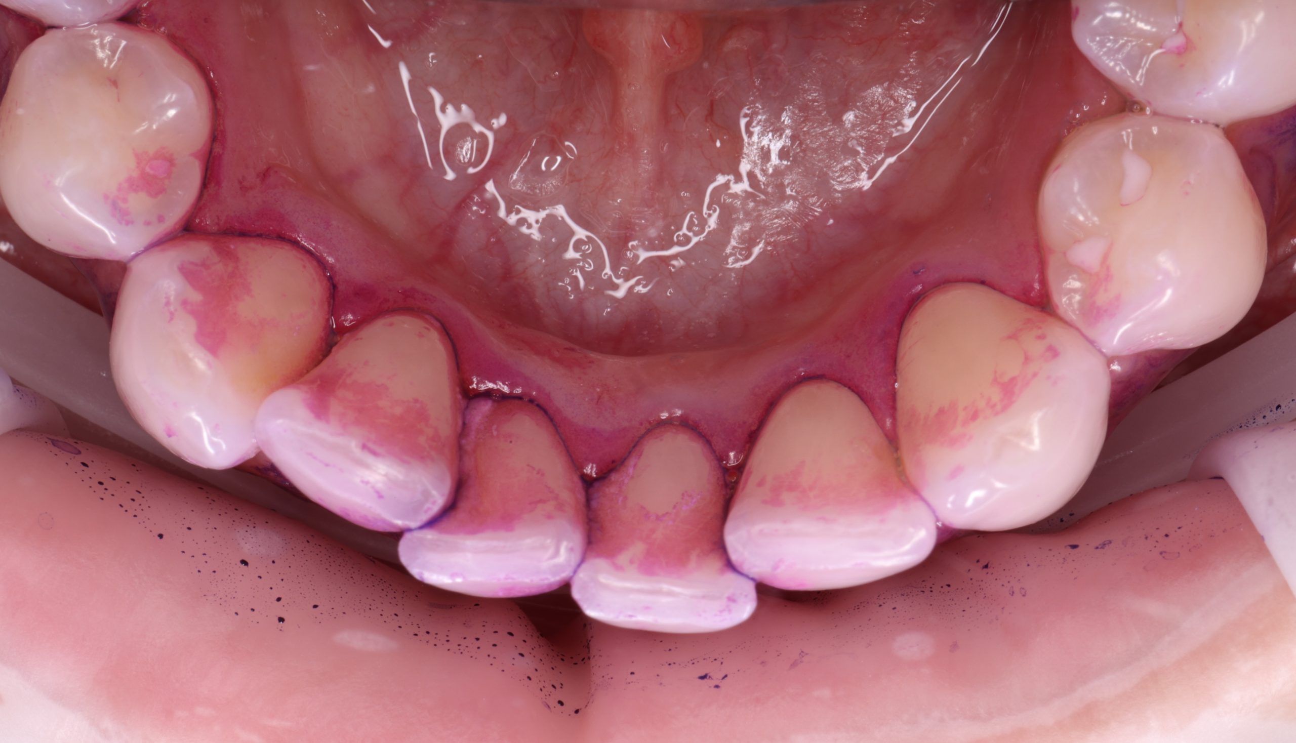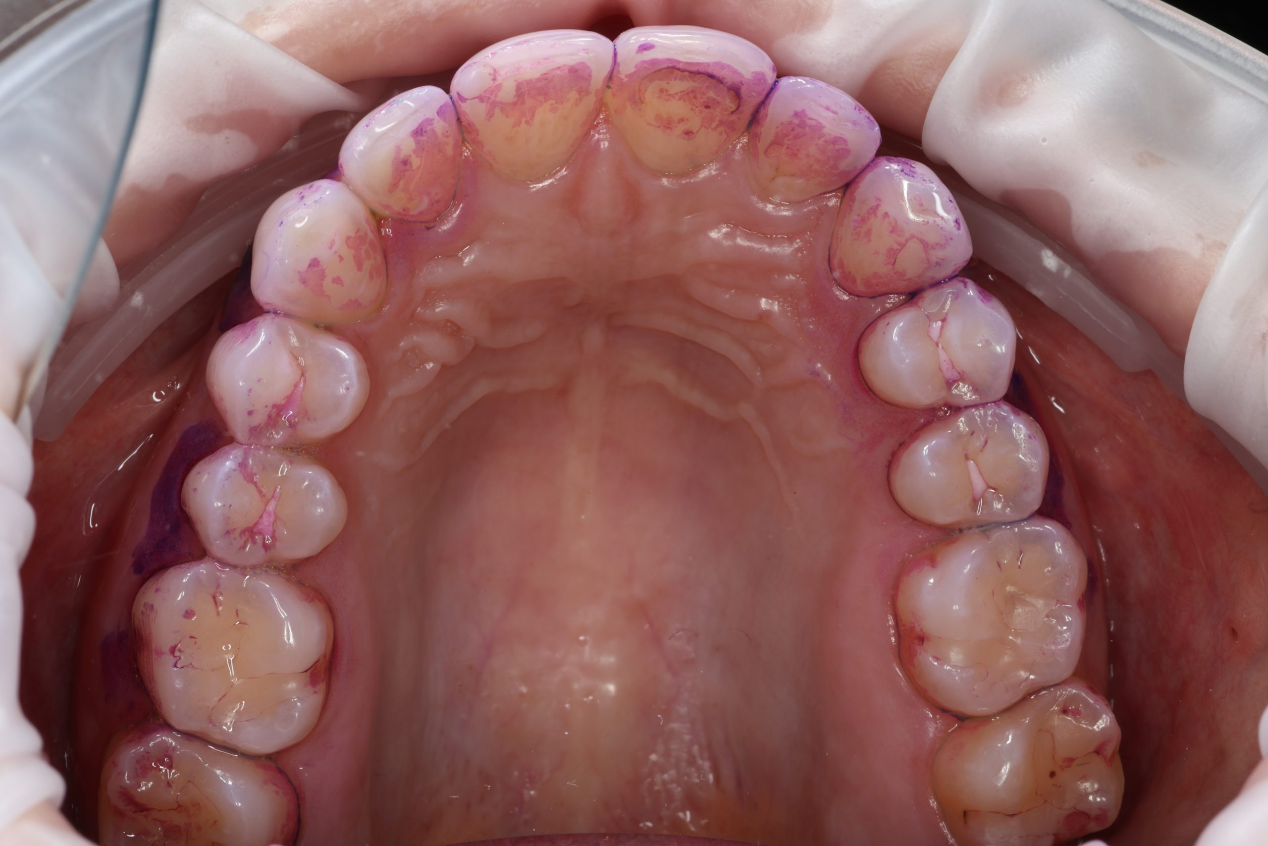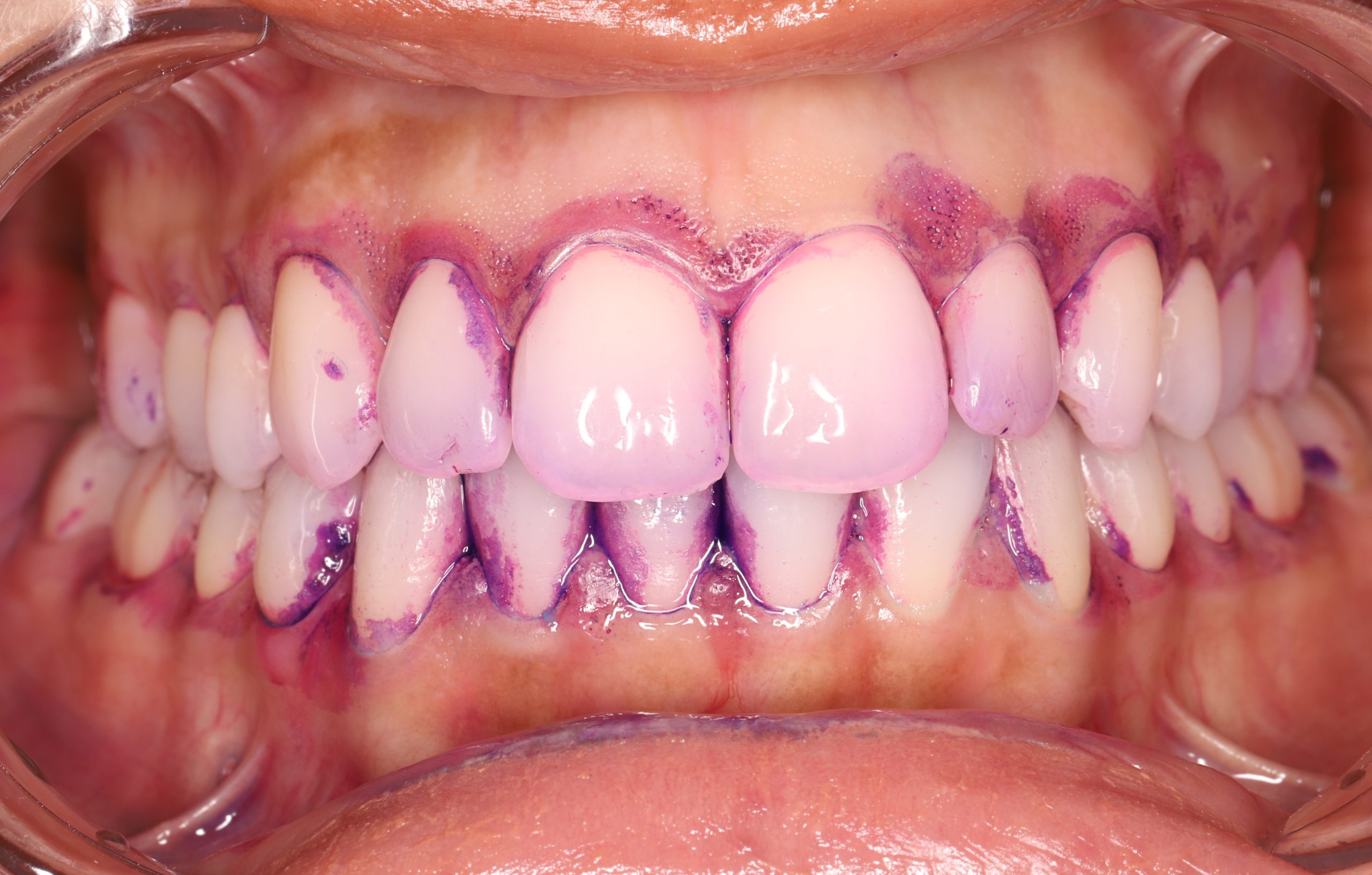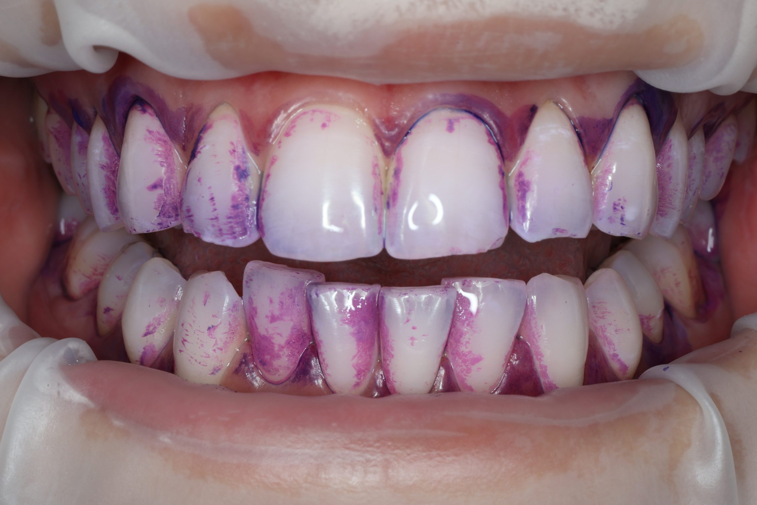 We apply a special dye to highlight biofilm. This lets us identify problem areas and show you where brushing is less effective.